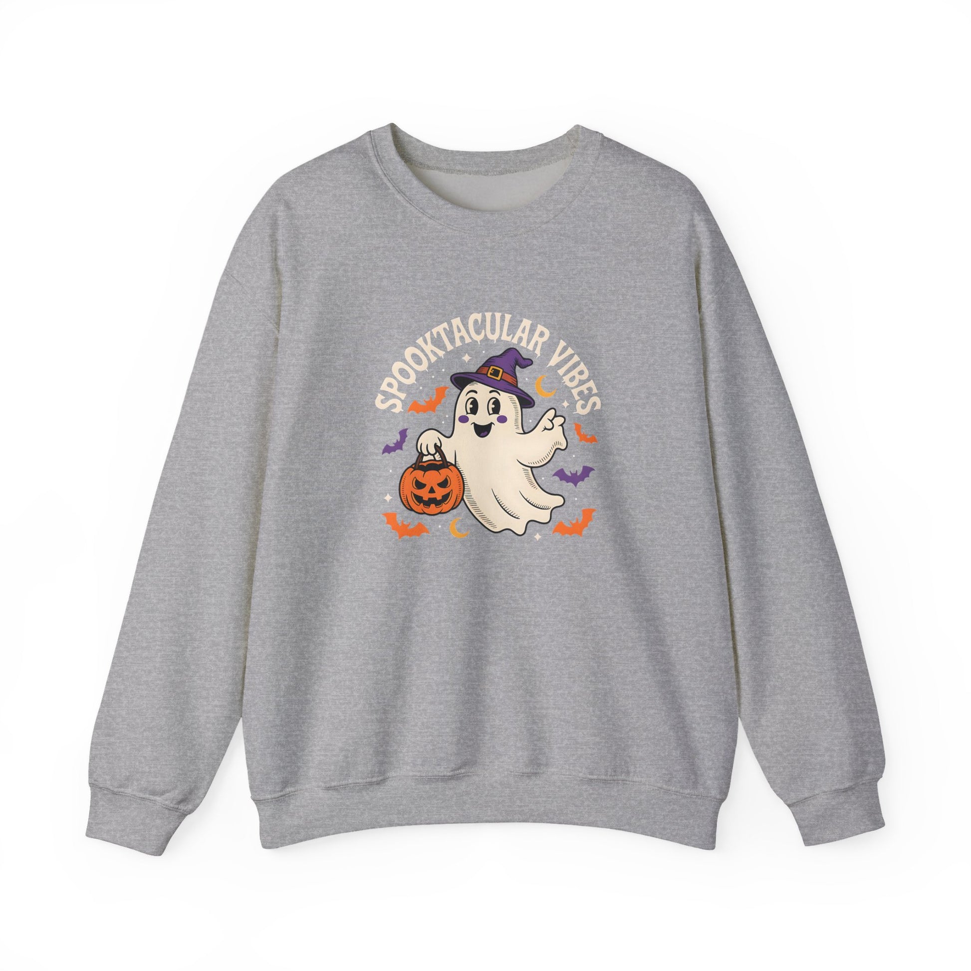 Get ready to feel all the "Spooktacular Vibes" this Halloween season! ✨ Our adorable crewneck features the cutest little ghostie, rocking a classic witch hat and holding a grinning jack-o'-lantern candy bucket, surrounded by flying bats and crescent moons. It’s the ultimate statement piece for anyone who loves the fun and festive side of spooky season! 🧡💜🌙
